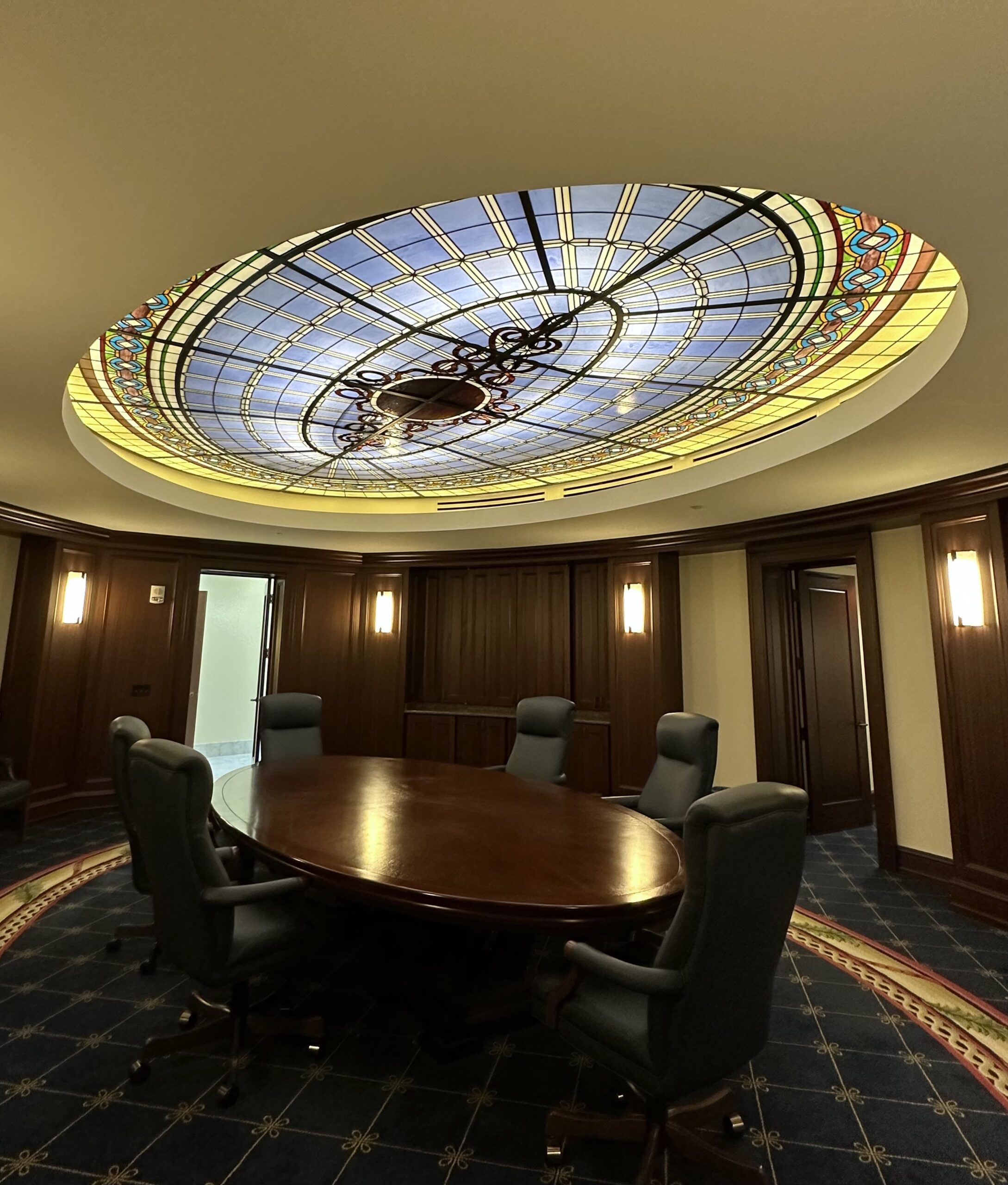The restored stained glass panels are reinstalled and may be protected with properly designed protective glazing systems..