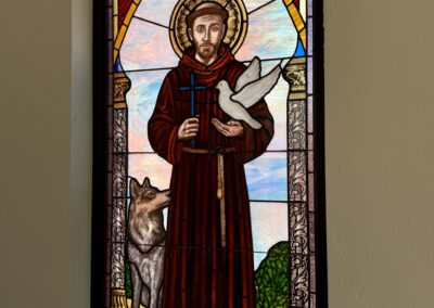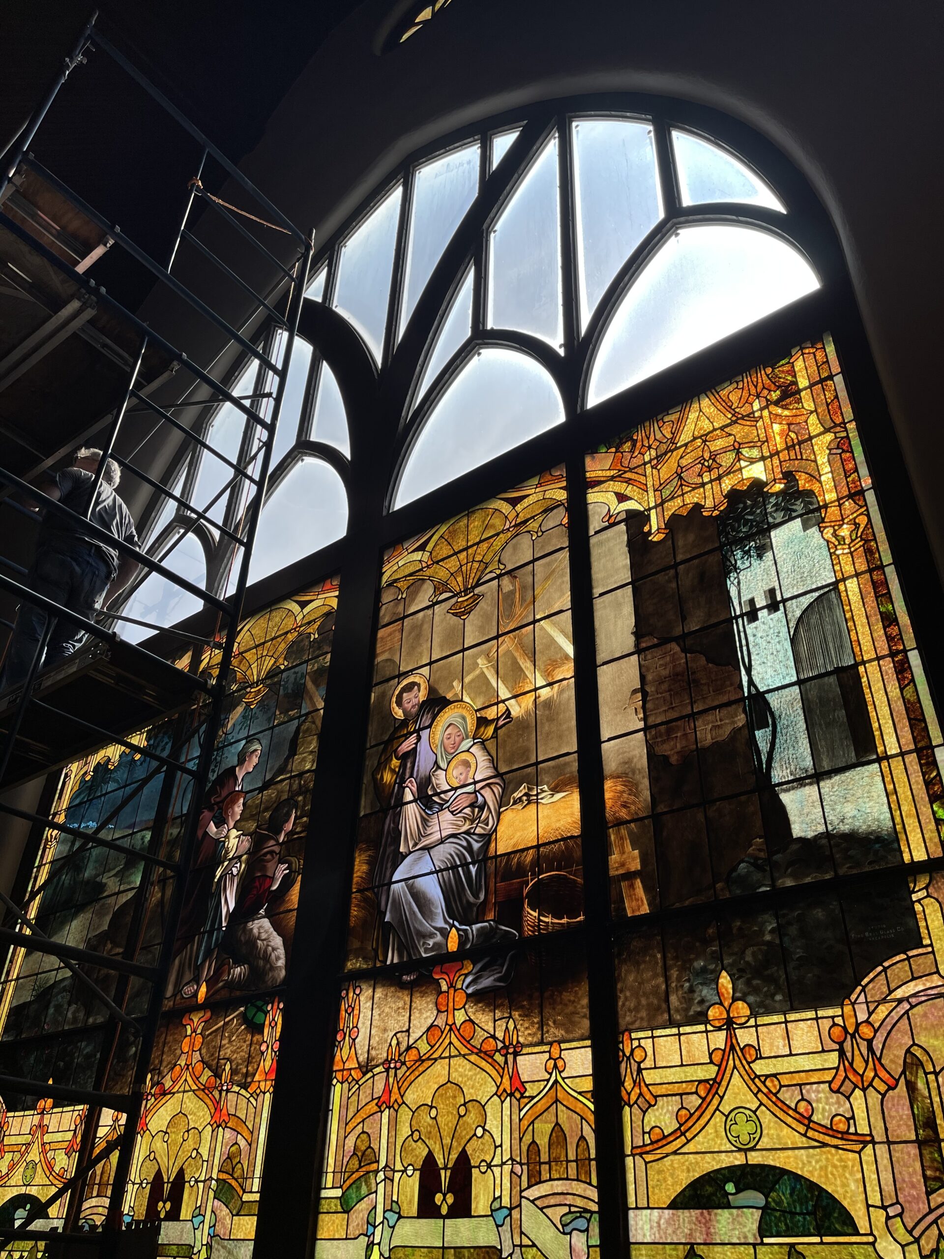 Complete restoration of historic stained glass windows including cleaning, glass repair, releading, and structural stabilization.